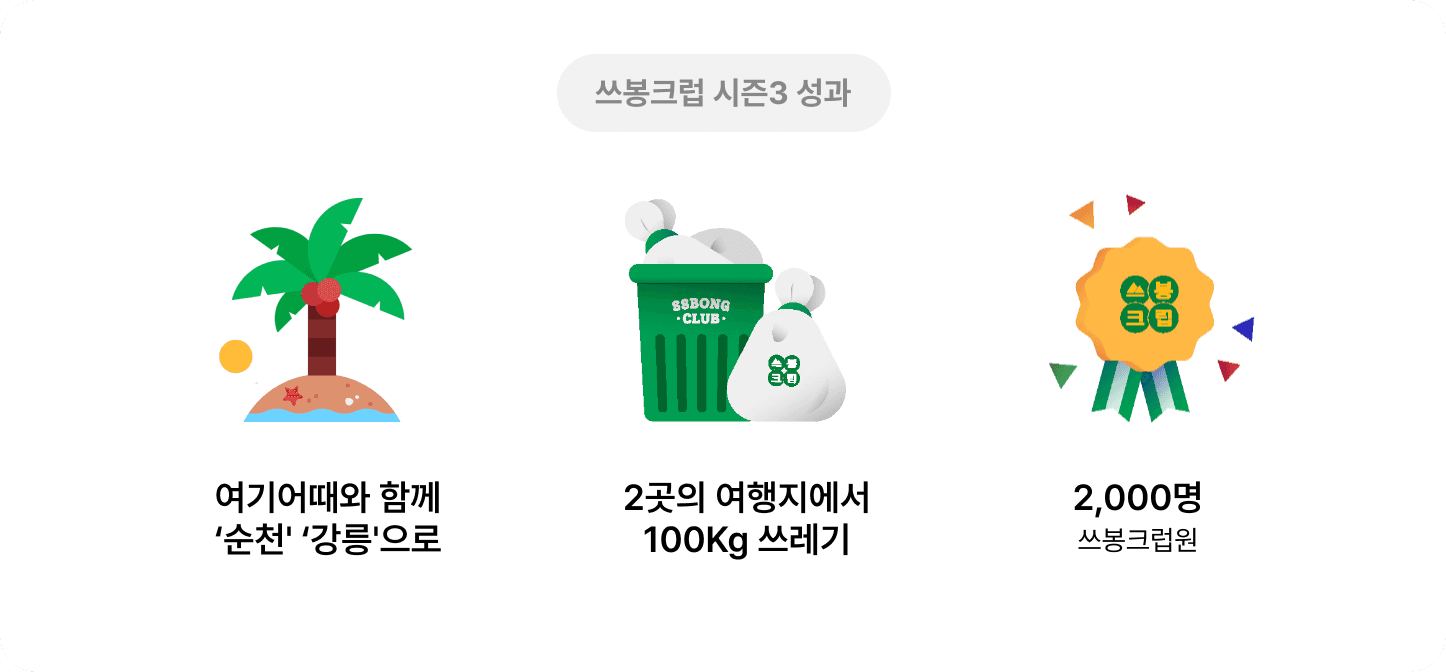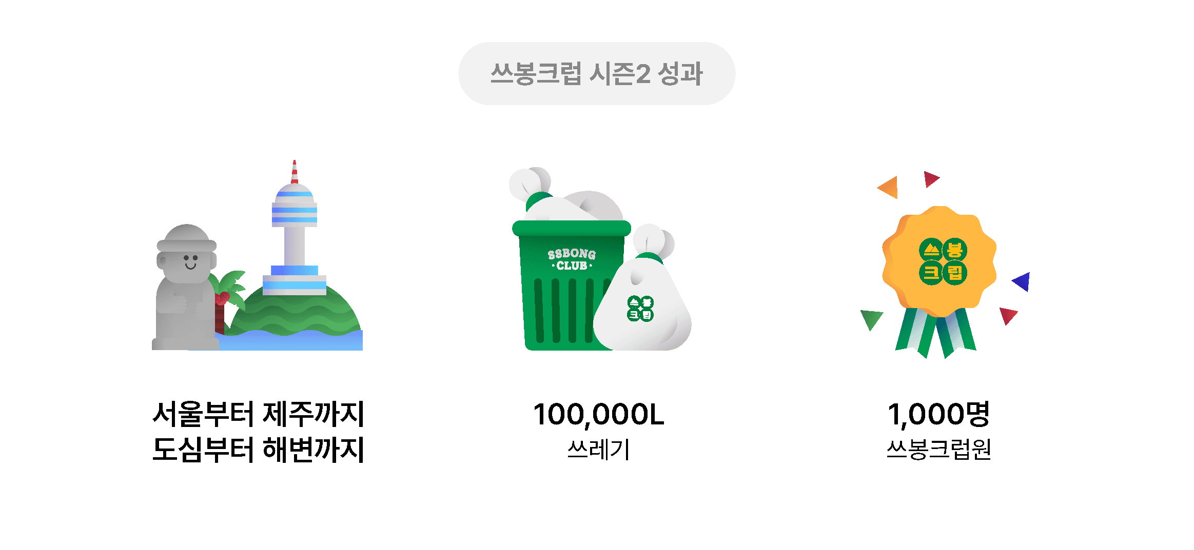 지역별 크럽원들이 늘면서, 석촌 호수공원 및 남산 등 수도권 여행지부터 한 해 가장 많은 관광객이 찾는 제주 해변까지 플로깅 장소도 다채로워졌는데요. 덕분에 시즌2를 마무리하며 약 10만 리터에 가까운 쓰레기를 수거할 수 있었습니다.