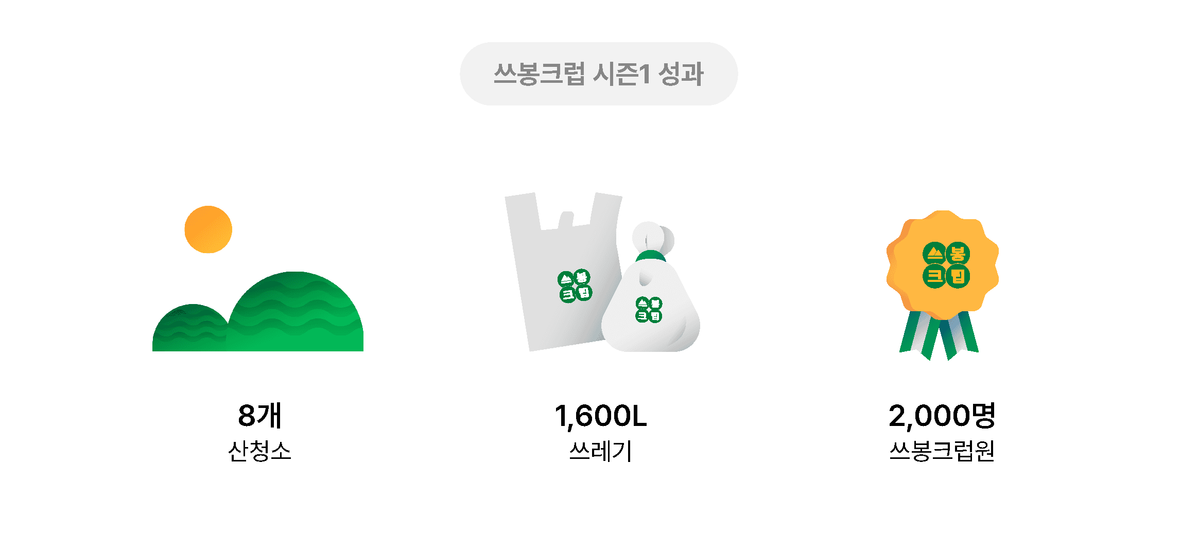 가을산 대청소는 약 2,000명의 크럽원들이 함께했는데요. 직접 플로깅에 참여한 크럽원부터 추후를 기약하며 쓰레기 봉투를 챙겨간 분들까지, 쓰봉크럽의 취지에 공감해 준 분들이 많았습니다. 덕분에 단시간 내 총 1,600L에 달하는 쓰레기를 수거했어요. 이토록 개운하고 시원한 여행이라니 🥰